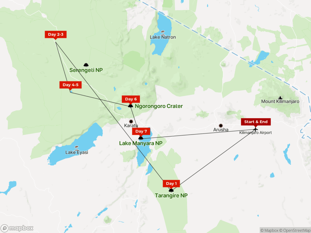 Your tour begins on (to be confirmed) in Kilimanjaro Airport, and runs over 7 days,
