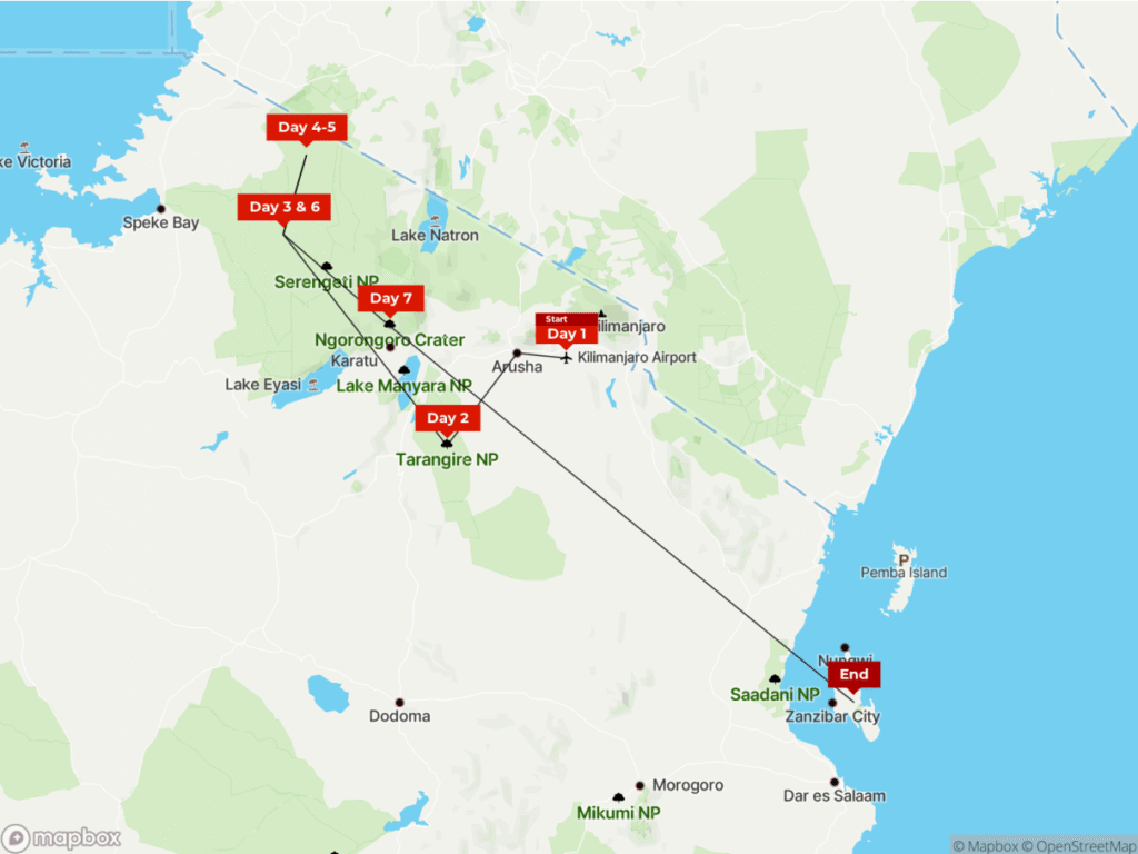 Your tour begins on (to be confirmed) in Kilimanjaro Airport, and runs over 7 days,